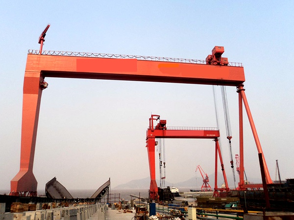 造船龙门吊的主梁跨度可定制(通常 60-300m),起升高度可达 100m 以上,能完全覆盖船坞宽度和船舶建造高度需求。小到几十米的快艇,大到超大型集装箱船、散货船、LNG 船,均可通过单台或多台龙门吊协同作业完成总段吊装。